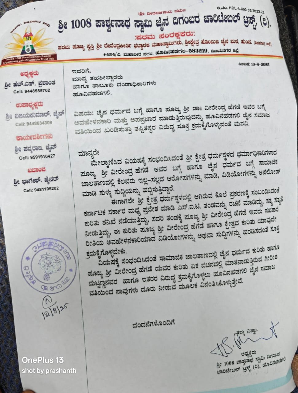 ಜೈನಧರ್ಮ - ಧರ್ಮಸ್ಥಳ ಶ್ರೀ ಮಂಜುನಾಥ ಸ್ವಾಮಿ ದೇವಾಲಯ, ಪೂಜ್ಯ ಶ್ರೀ ವೀರೇಂದ್ರ ಹೆಗಡೆ ಗುರಿಯಾಗಿಸಿಟ್ಟುಕೊಂಡು ನಿತ್ಯ ಅಪಪ್ರಚಾರ ನಿಂದನೆ ಕಾಯಕ ಮಾಡಿಕೊಂಡಿರುವ ಮುಟ್ಟಾಳರ ಹೆಡೆಮುರಿಕಟ್ಟಿ ಶಿಕ್ಷೆ ನೀಡಲು ಮಲ್ಲಿಗೆ ನಾಡಿನ ಸಮಸ್ತ ಜೈನ ಸಮಾಜ ಪ್ರತಿಭಟನೆ ಹಮ್ಮಿಕೊಳ್ಳಲಾಗಿತ್ತು. ಪ್ರತಿಭಟನೆ ನೇತೃತ್ವವನ್ನು ಶ್ರೀ ಪಾರ್ಶ್ಶ್ವನಾಥ ಸ್ವಾಮಿ ಚಾರಿಟೇಬಲ್ ಟ್ರಸ್ಟ್, ಭಾರತೀಯ ಜೈನ ಮಿಲನ, ಶ್ರೀ ಜ್ವಾಲಮಾಲಿನಿ ಮಹಿಳಾ ಸಮಾಜ ವಹಿಸಿ ಪ್ರತಿಭಟನೆ ಯಶಸ್ವಿಯಾಗಿ ನೆರೆವೇರಿತು. ಶ್ರೀ ಪಾರ್ಶ್ಶ್ವನಾಥ ಸ್ವಾಮಿ ಜಿನ ಬಸದಿಯಿಂದ ಸಾಗಿದ ಪ್ರತಿಭಟನೆ ಹೂವಿನಹಡಗಲಿ ಪಟ್ಟಣದ ಮಿನಿ ವಿಧಾನ ಸೌಧ ತಹಸೀಲ್ದಾರ್ ಬಳಿ ಸಾಗಿ ತಹಸೀಲ್ದಾರ್ ಶ್ರೀ ಸಂತೋಷ ಕುಮಾರ ರವರಿಗೆ ಮನವಿ ಪತ್ರ ನೀಡಿ ಜೈನ ಧರ್ಮ, ಶ್ರೀ ಧರ್ಮಸ್ಥಳ, ಶ್ರೀ ವೀರೇಂದ್ರ ಹೆಗಡೆ ಕುರಿತು ಅಪಪ್ರಚಾರ ಮಾಡುತ್ತಿರುವ ದುಷ್ಟರಿಗೆ ಶಿಕ್ಷೆ ಕೊಡಲು ಸಭೆ ಅಗ್ರಹಿಸಿತು. ಈ ಸಮಾರಂಭದಲ್ಲಿ ಜೈನ ಸಮಾಜದ ಅಧ್ಯಕ್ಷರಾದ ಶ್ರೀ ಪ್ರಶಾಂತ್ ಎಚ್ ಎಸ್, ಜೈನ ಮಿಲನ್ ಅಧ್ಯಕ್ಷರಾದ ಶ್ರೀ ಸಂತೋಷ ಜೈನ್, ಶ್ರೀ ಜ್ವಾಲಮಾಲಿನಿ ಮಹಿಳಾ ಸಂಘದ ಅಧ್ಯಕ್ಷರಾದ ಶ್ರೀಮತಿ ಪದ್ಮಾವತಿ ಎಮ್ ಡಿ  ಸಂಘ ಸಂಸ್ಥೆ ಪದಾಧಿಕಾರಿಗಳು ಮತ್ತು ಹೂವಿನಹಡಗಲಿ ಪಟ್ಟಣದ ಸದ್ ಭಕ್ತ ಜೈನ ಶ್ರಾವಕ ಶ್ರಾವಿಕಿಯರು ಭಾಗವಹಿಸಿ ಪ್ರತಿಭಟನೆ ಯಶಸ್ವಿಗೊಳಿಸಿದರು.